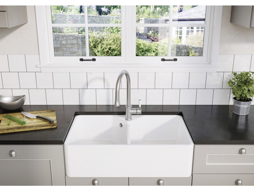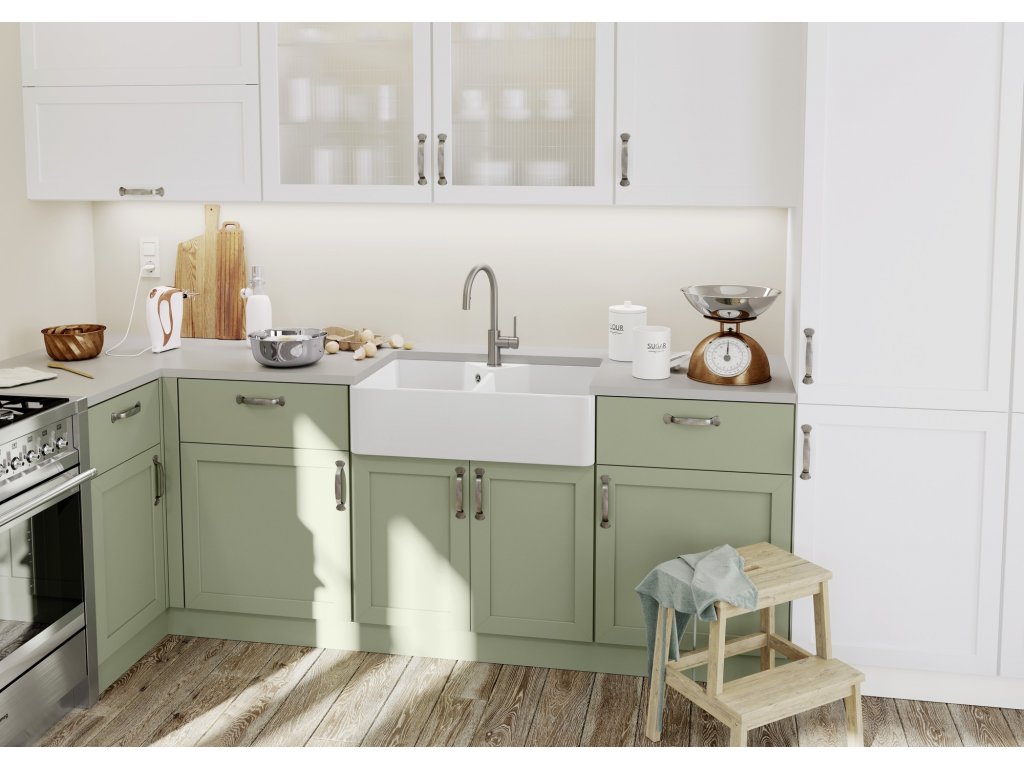 Blanco Villae Farmhouse Double je keramický kuchynský drez v klasickom dizajne, s praktickými vaničkami, bez odkvapovej plochy. Je určený na montáž pod pracovnú dosku - táto montáž je vhodná pre pracovné dosky z prírodného alebo umelého kameňa, keramiky, skla, masívneho dreva a kompozitných materiálov, ktoré sú odolné voči vlhkosti a dostatočne pevné. Celkové rozmery drezu sú 794 x 490 mm. Vaničky majú rozmer 366 x 449 mm a hĺbku 195 mm.