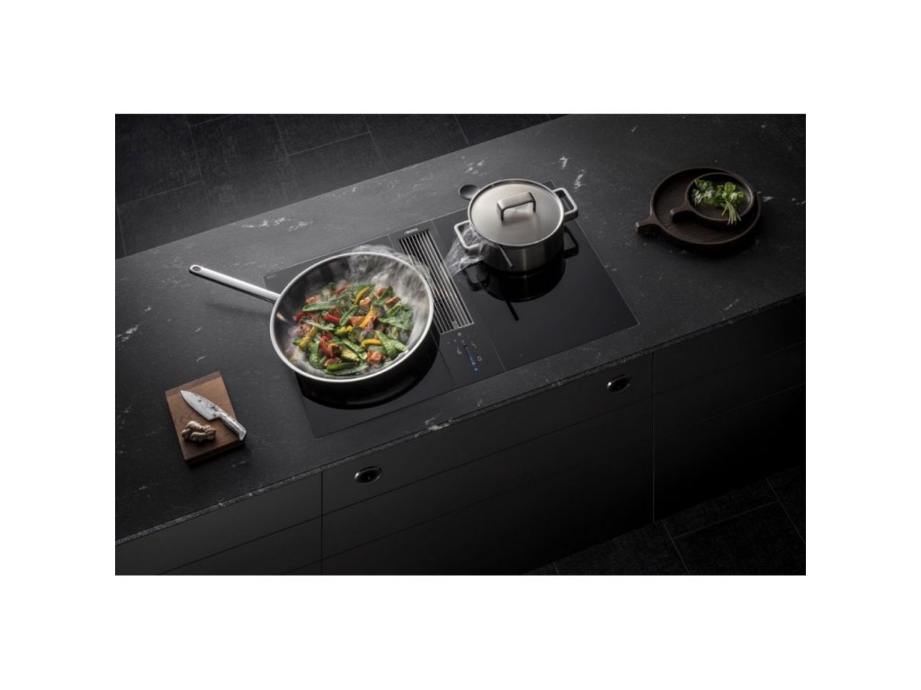 Varná doska a digestor sú úplne zapustené. Dokonalé vedenie línie umožňuje tiež nenápadné a zároveň vysoko elegantné začlenenie do každej modernej kuchyne. Ovládanie v pohotovostnom režime je takmer neviditeľné a počas prevádzky zredukované na inteligentné osvetlenie toho najdôležitejšieho.