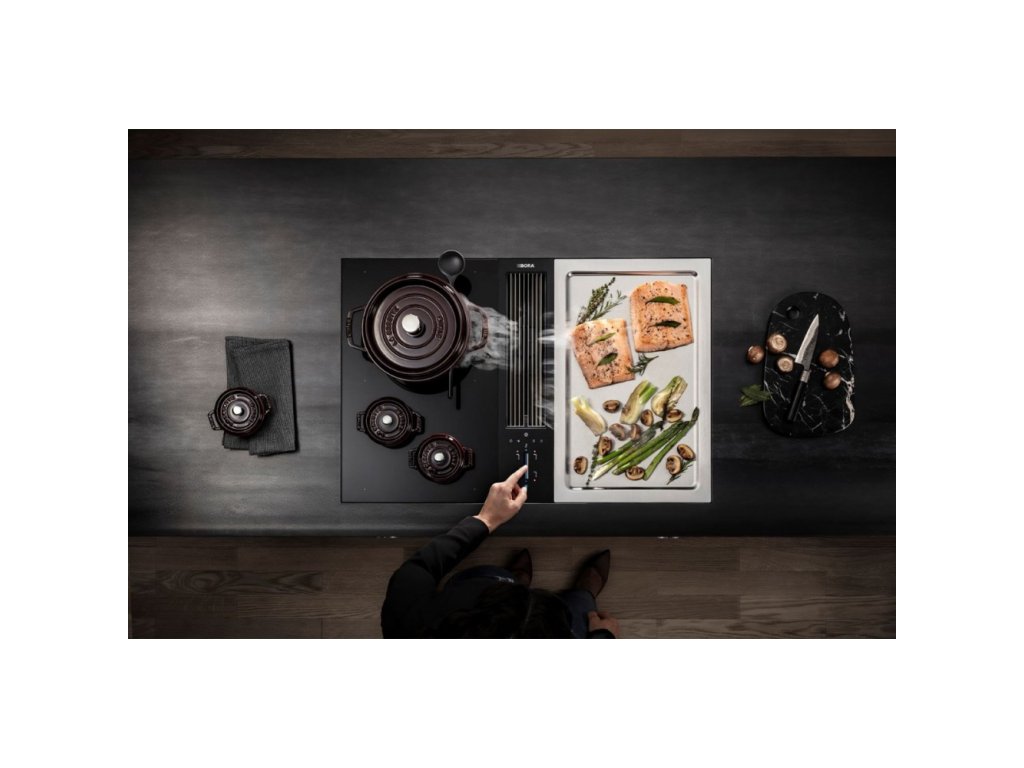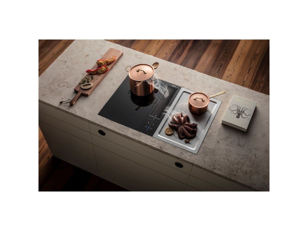 Varná doska a digestor sú úplne zapustené. Dokonalé vedenie línie umožňuje tiež nenápadné a zároveň vysoko elegantné začlenenie do každej modernej kuchyne. Ovládanie v pohotovostnom režime je takmer neviditeľné a počas prevádzky zredukované na inteligentné osvetlenie toho najdôležitejšieho.