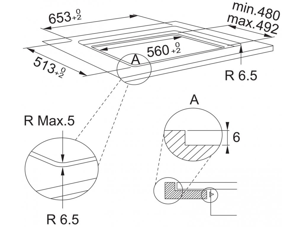 - Výrez pre hornú montáž: 560 x 480 mm