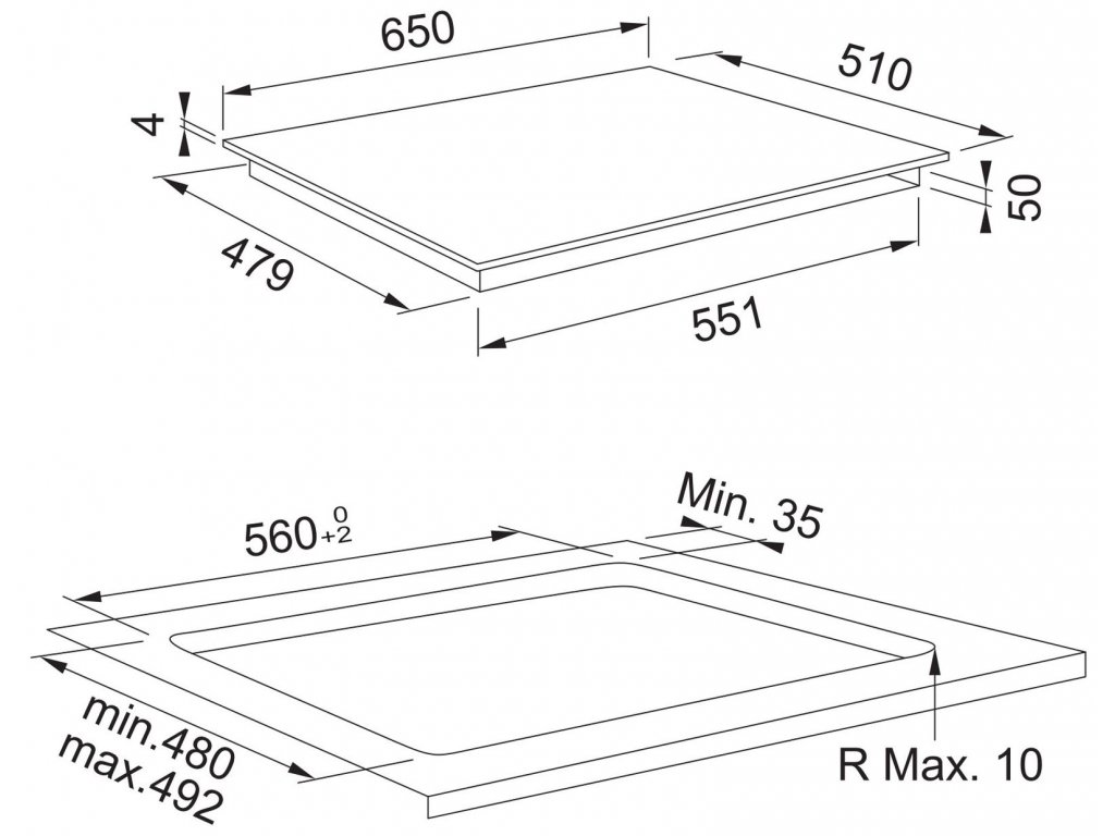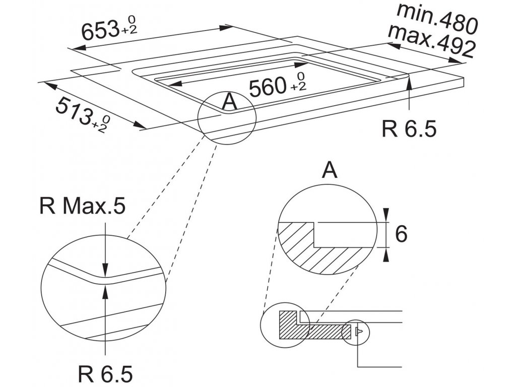 - Výrez pre hornú montáž: 560 x 480 mm
