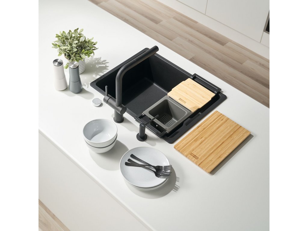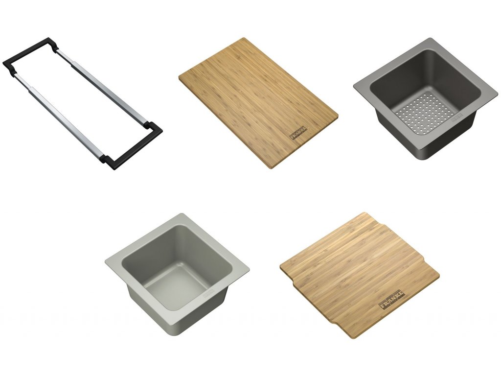 Franke ALL-IN sada príslušenstva Set 2 - držiak, doska na krájanie, malá odkvapkávacia miska, miska a drevené veko na misku.