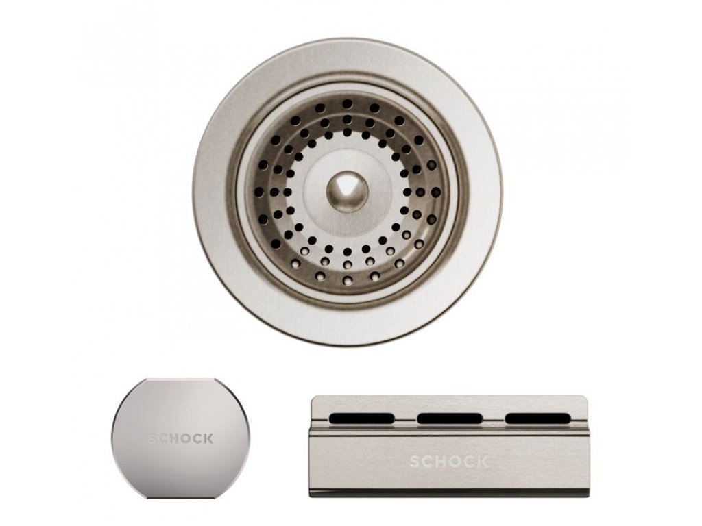 Sada kovových časti k drezu Schock. Týmto príslušenstvom môžete nahradiť pôvodné komponenty v sáčku s príslušenstvom, ktorý je obsahom balenia drezu - prepad, sitko, výpusť, ovládač excentra.